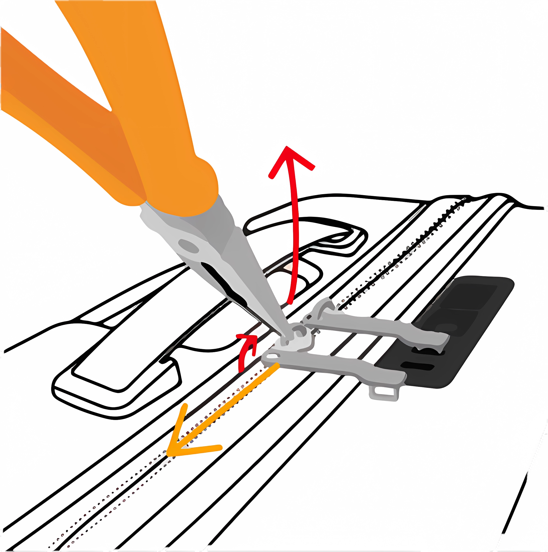 Après l'insertion du nouveau Tirette à Fermeture Éclair, la tête de la fermeture éclair doit être refermée pour sécuriser le Tirette à Fermeture Éclair. Utilisez les pinces pour appuyer doucement sur le Tirette à Fermeture Éclair.